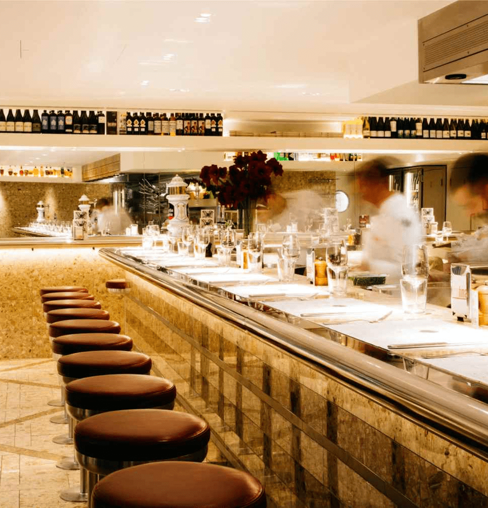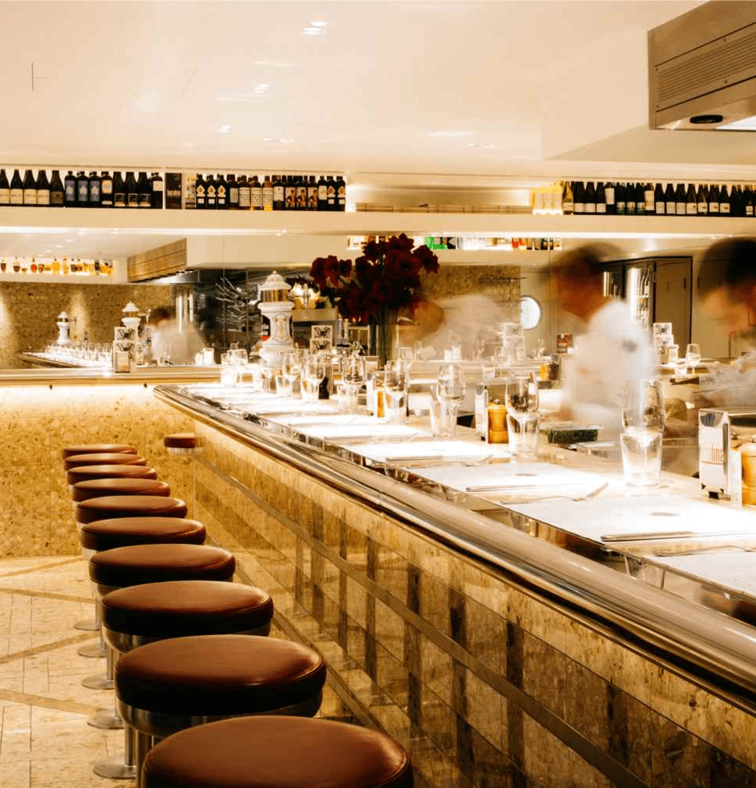 The guests eat and drink on a beautiful marble-topped bar where and watch the chefs at work. The front of house teams work around the bar, creating an energetic and uniquely enjoyable service.